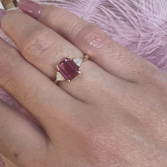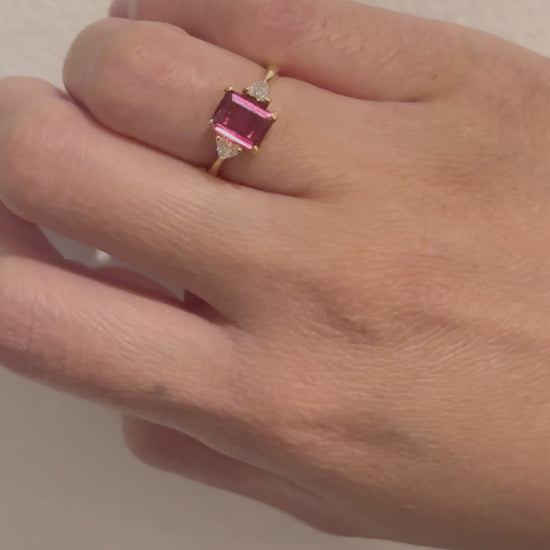 Make a bold yet romantic statement with this 18K Gold Ring, featuring a stunning emerald-cut Pink Tourmaline accented by heart-cut diamonds. This unique design blends timeless elegance with a touch of whimsy, making it a perfect piece for both everyday luxury or special occasions.